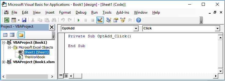 You will add your code between the “Private Sub OptAdd_Click()” and “End Sub” lines. For the remaining two buttons, you will also be adding code in between the “Prive Sub…” and “End Sub” lines for each Option Button.