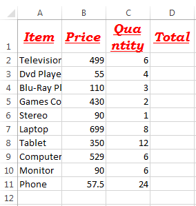 Next time, we will add formula to cell D2 to multiply the price by quantity in row 2.