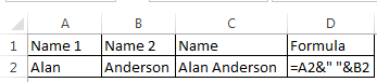 If we want a space between each name, then we ask Excel to join A2 & blank space & B2