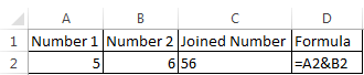 - Cell C2 has a formula in it, joining A2 and B2 (5&6 = 56)