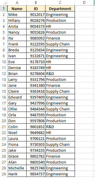 But rather than sorting departments in alphabetical order, we will apply a custom sort to list people in Supply Chain, then HR, then Finance, then R&D and then Engineering.