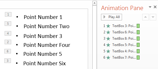 Note our animation pane has only 1 number and in the presentation slide, “1” is beside all 6 points.